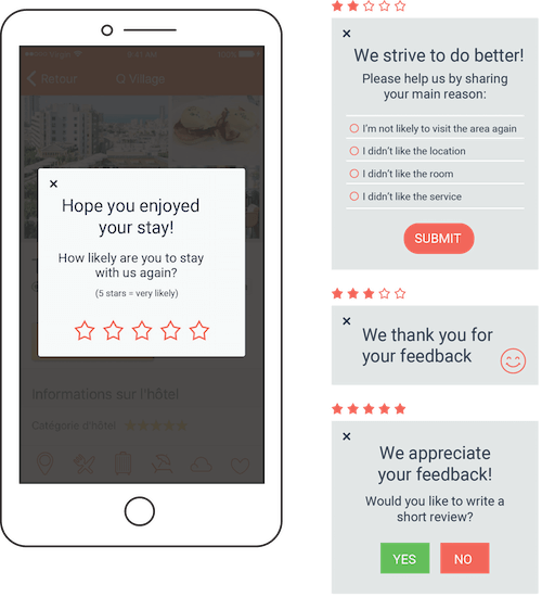 In the example below, a user who says that they wouldn’t likely return to a hotel is shown another screen that asks them their main reason for not returning. Meanwhile, those who respond very positively are asked whether they would like to write a short review.