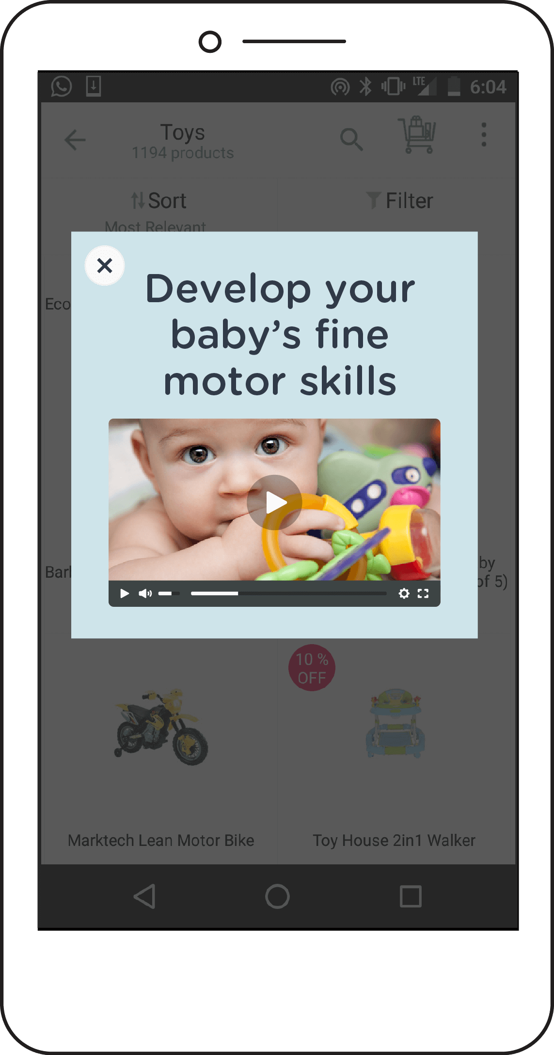 If you’ve already used banners or in-app messages (triggered at the right time, of course) to promote this particular product, but your users aren’t converting as much as you’d like, then a video could be a great way to improve your conversion rates. In the example below, an explainer video is triggered when users who have already engaged with items such as baby food and baby clothes in past sessions are now visiting your toys section for the first time. The video drives purchasing intent by explaining how the baby toy would nurture their baby’s development.
