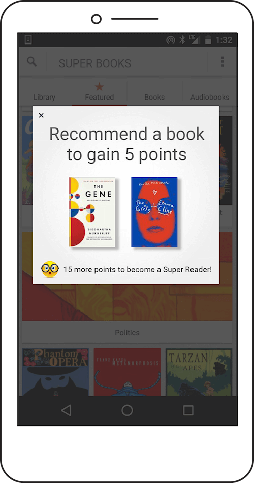 In the example below, a frequent user of a bookstore app is asked to recommend a book to a friend to gain 15 points to become a “Super Reader.” This is a great example of how gamified messages give users the feeling that they are an integral part of your app’s community. In addition, they will be thrilled to be recognized for their commitment to your app and to know that you appreciate them.