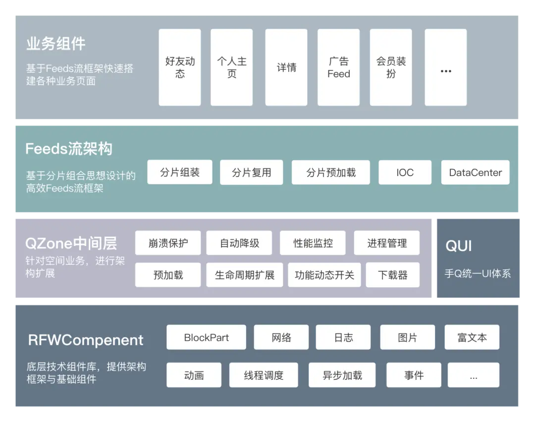 我們徹底拋棄了空間老的技術組件,與團隊內部沉澱的 RFWComponent 進行架構融合,同時也積極接入手 Q 統一的 UI 體系。保證開發能專注於業務中間層開發。