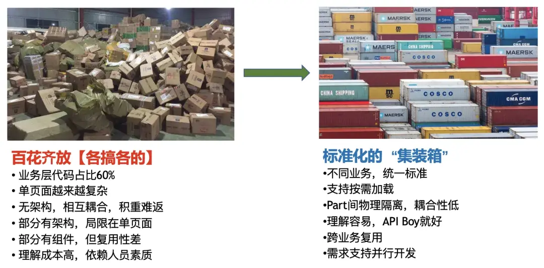 | 代碼複雜度持續膨脹; 各業務代碼耦合; 功能代碼分散,AB 測試不友好; 難以擴展。 |