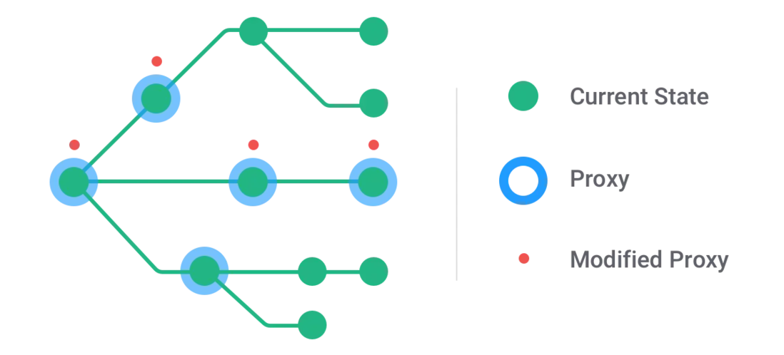 When the producer finally ends, it will just walk through the proxy tree, and, if a proxy is modified, take the copy; or, if not modified, simply return the original node. This process results in a tree that is structurally shared with the previous state. And that is basically all there is to it.