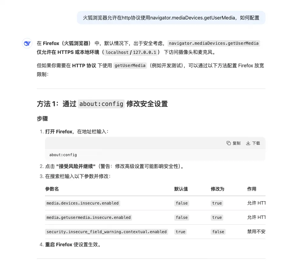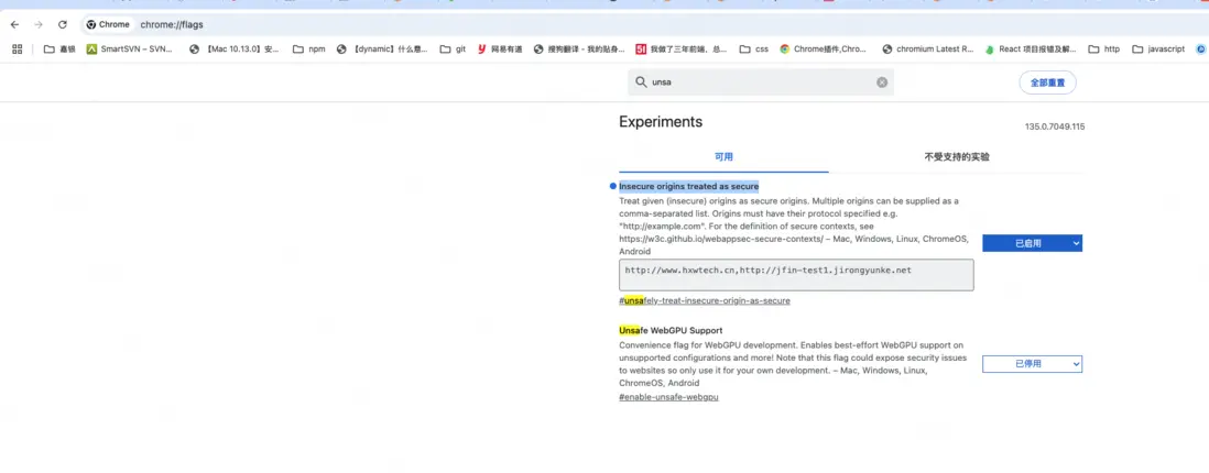 如果需要再http協議下使用navigator.mediaDevices.getUserMedia,需要打開不安全的配置。