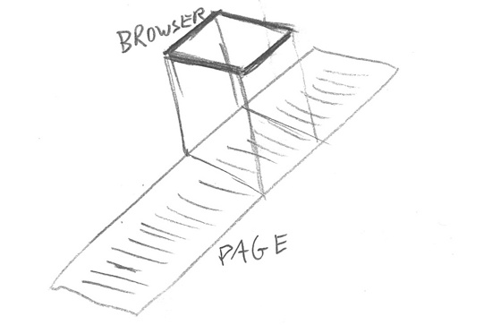 One of the team’s early breakthroughs was in figuring out how to split up the website’s elements. You can see in the sketch below how a website normally works: you have a long page and, conceptually speaking, the browser’s viewport moves up and down the page (i.e. the latter moving across the former).