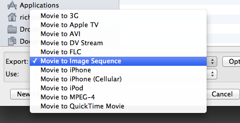 Choose Share → Export Using QuickTime, and in the pop-up dialog box select “Movie to Image Sequence.”