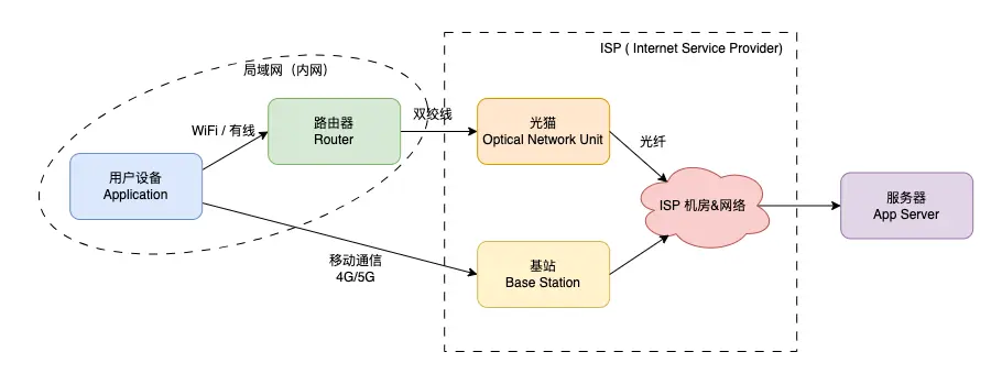 在此拓撲中,終端設備通過 WiFi 連接到路由器,路由器再連接到光貓(或終端設備通過移動網絡 4G/5G 連接到基站),之後 ISP 網絡服務提供商接管網絡通信,將請求最終轉發至應用服務器。