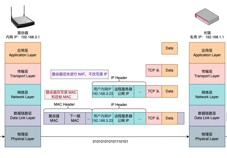 路由器在物理層接收到二進制數據後,將數據解析成上一層的數據鏈路層格式,隨後改寫源 MAC 和目標 MAC 地址,將數據發送到下一跳設備(光貓)。