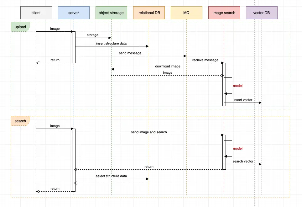 - 圖像搜索服務接受 MQ 的消息,下載圖像內容,使用特定模型提取圖像特徵向量,然後將特徵向量插入到向量數據庫。
