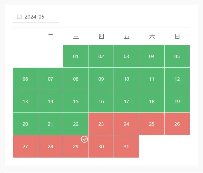 由於業務需求,日曆只展示當前月份數據,使用css將上個月份和下個月份數據進行隱藏,所以日曆有時是5行數據展示,有時是6行數據展示,但是總的高度(420px)不變,所以每個格子高度就需要根據行數動態進行設置。