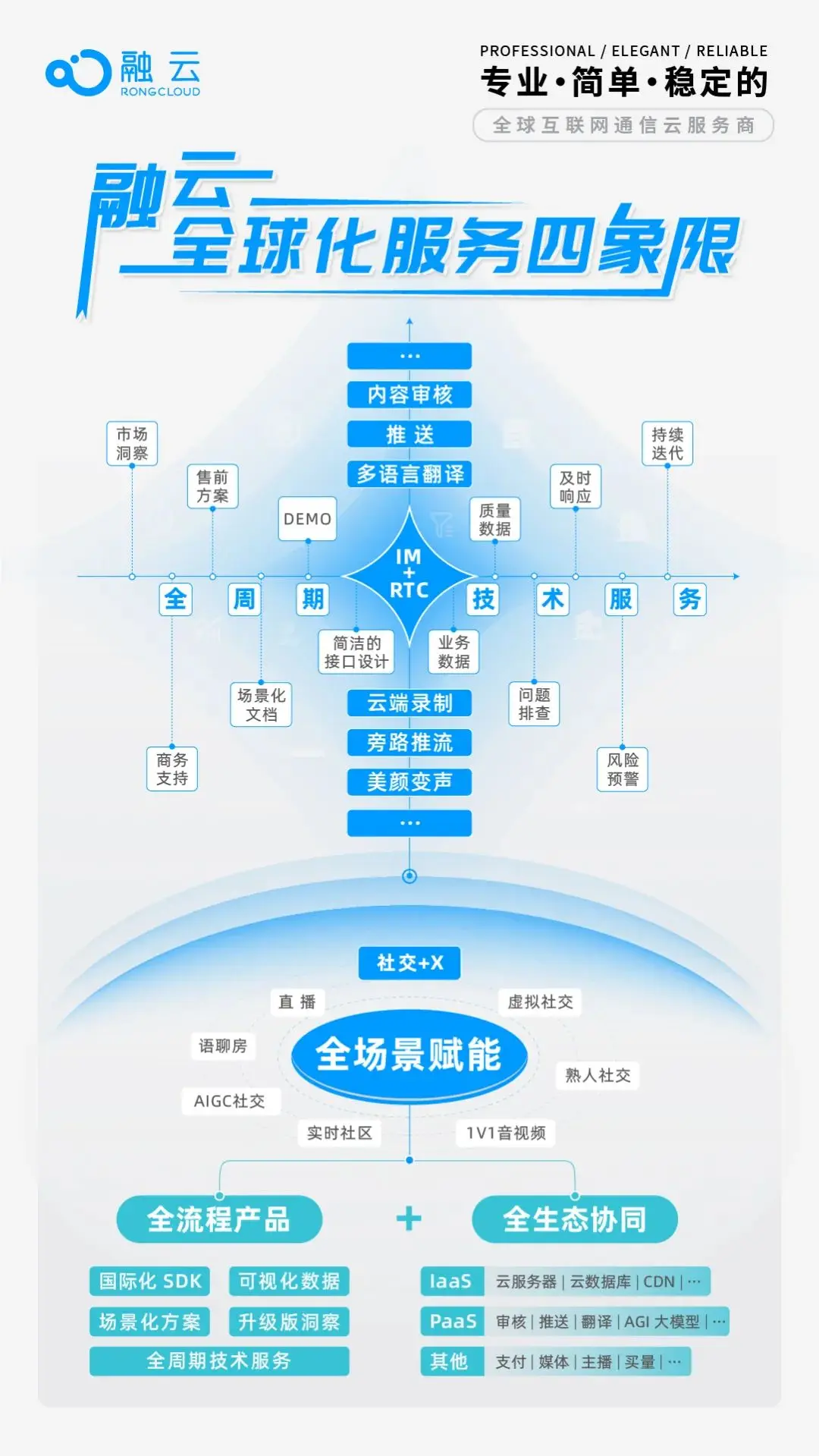 作為專業、簡單、穩定的全球互聯網通信雲服務商,融雲還將繼續完善生態、提升產品和服務、融合創新技術,進一步滿足應用出海、全球增長對通信服務效率優化和體驗升級的要求,與開發者攜手創造全球化潮起大勢。