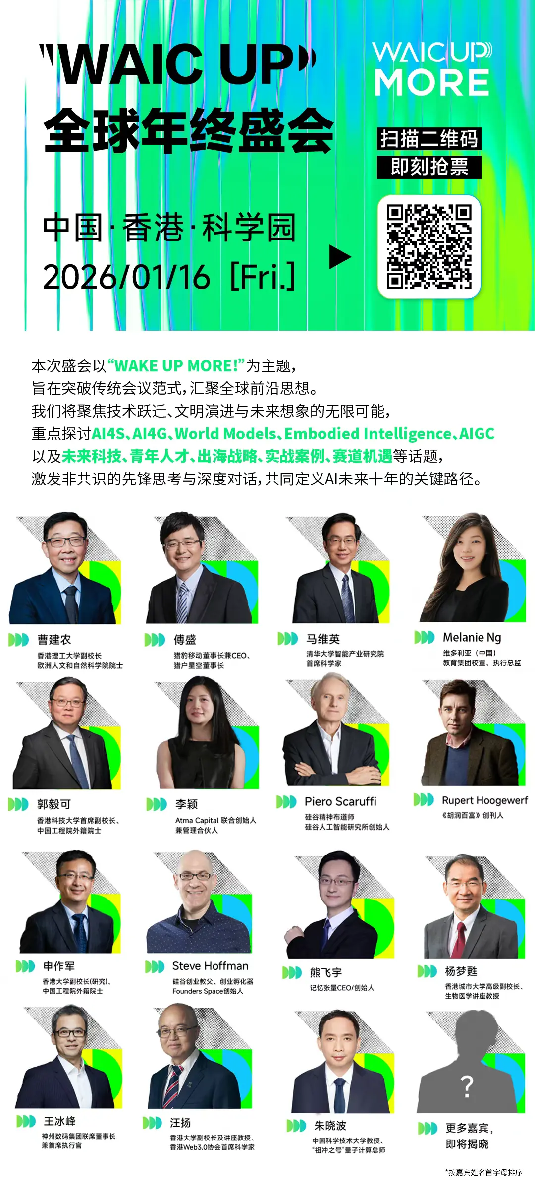 如今,我們正站在另一個範式轉換的臨界點:從單模態到多模態,從雲端到邊緣,從工具到夥伴……這些AI趨勢的把握,不能僅靠閉門研發,更需要站在巨人肩膀上的思想啓迪。上午場 “WAKE思想覺醒” 正是為此而設。