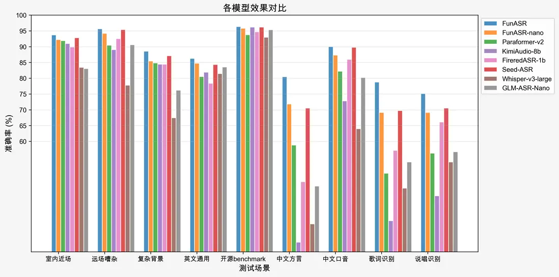在通用不同場景的測試集中,Fun-ASR-Nano-2512均取得了不錯的準確率指標,達到了商業可用的水平。