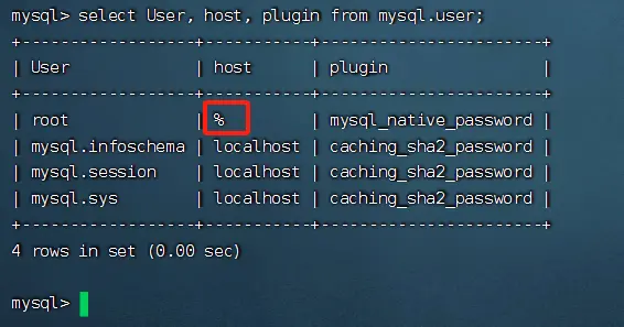 select User, host, plugin from mysql.user;
