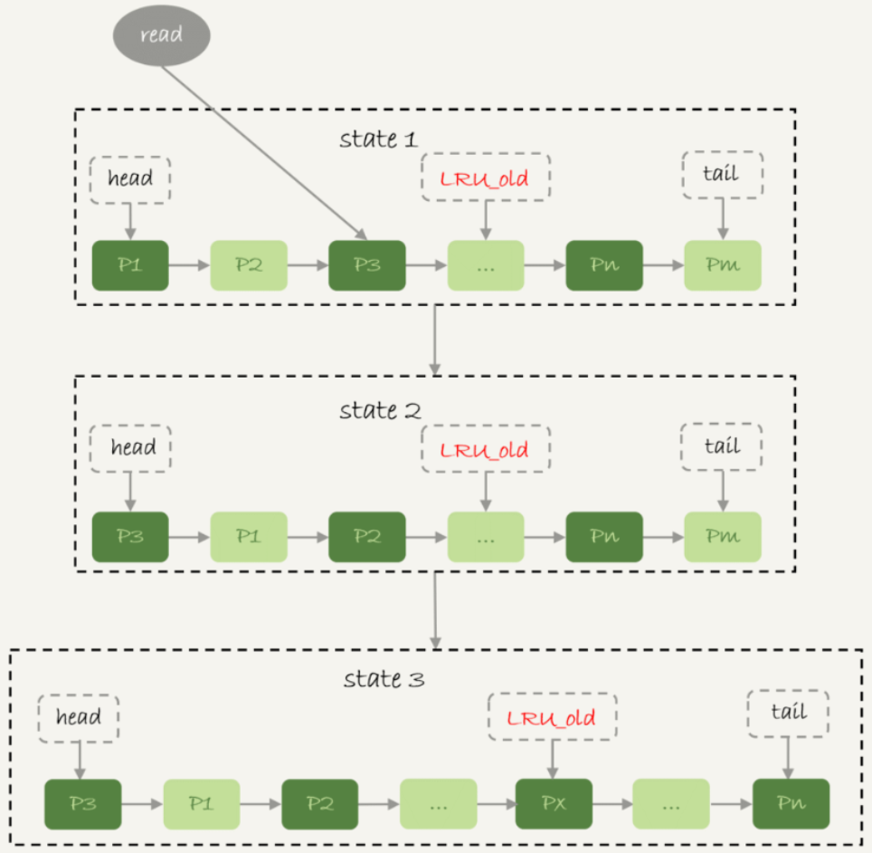 state 3,想要訪問一個新的、不存在於當前鏈表的數據頁,此時會淘汰尾部的數據頁Pm,將新插入的數據頁Px放在LRU_old處。