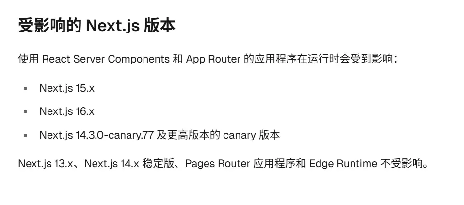 看看這個影響版本列表,基本上現在正在跑 Next.js App Router 的項目全軍覆沒,熱門版本無一倖免!