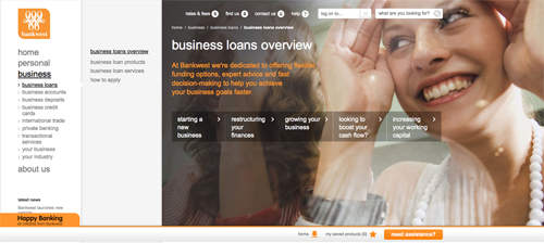 Bankwest does not use sliding animations, but it’s a good example of a multi-tiered navigation system. They have a left-aligned top level navigation, which expands first vertically and then horizontally as the user navigates deeper. This is another good strategy for a very deep, content-heavy site. While it works very well as it is, a little JavaScript interaction allows users to peruse the deeper levels of navigation a bit more easily, making it even more effective. Notice the breadcrumbs navigation at the top of the content area: it supports the navigation and helps the users track their path throughout the website.