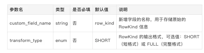 指定新增字段的名稱,該字段用於存儲原始的 RowKind 信息。