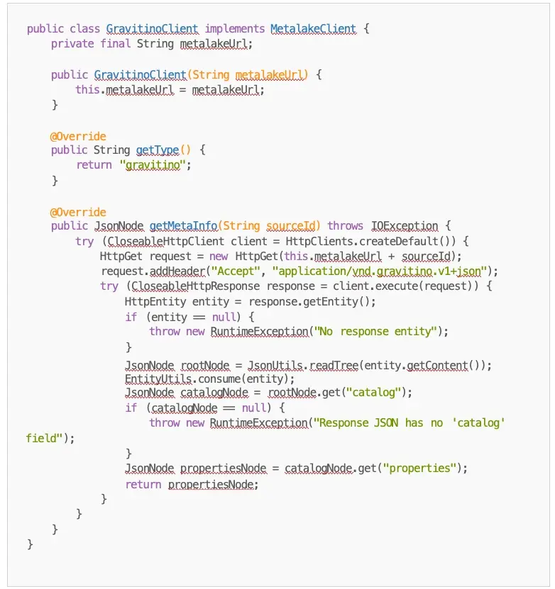 GravitinoClient類,實現MetalakeClient接口。 - 使用HTTP客户端發送請求到Gravitino API,並解析響應。