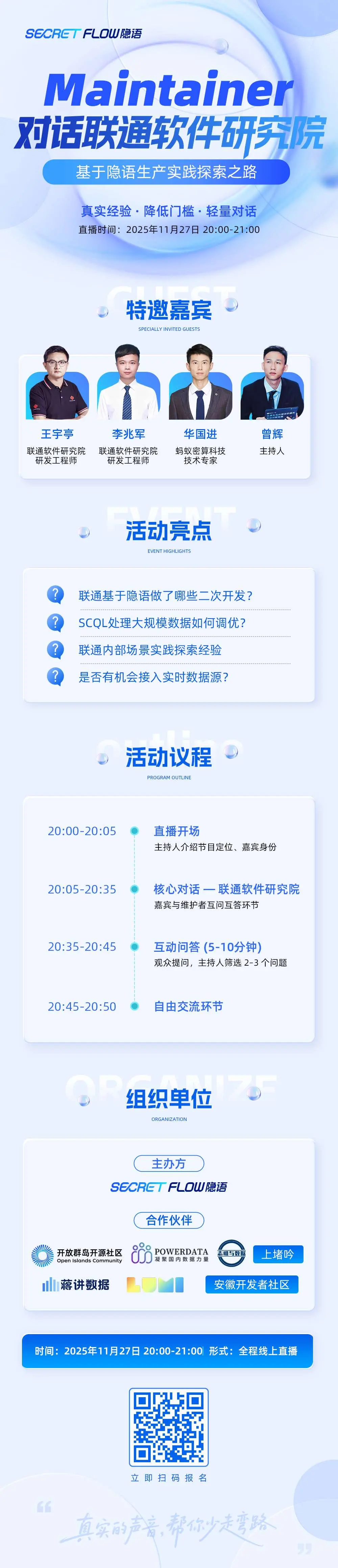 如果你正在推動通信/政企領域的數據協同,正面臨合規壓力、技術選型難題,或是對隱語SecretFlow充滿興趣與探索,這期對話一定會給你新的啓發。11月27日 20:00,和聯通軟研院一起,走進隱語在可信數據流通的探索之路