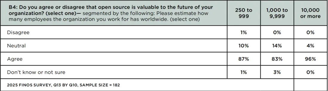 但價值量化仍面臨挑戰:32%的受訪者不確定開源帶來的年度成本節約,45% 的大型機構表示“無法準確量化”。這一問題導致部分金融機構對開源的投入仍持謹慎態度,難以形成持續的資源支持。