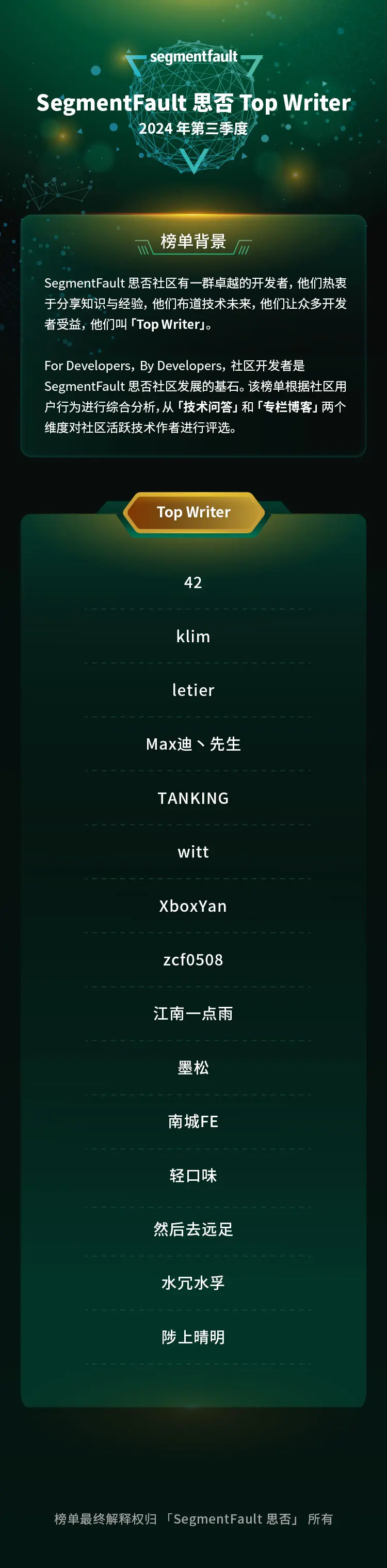 為了感謝 2024 年第三季度中對社區做出卓越貢獻的開發者們,我們基於用户行為大數據(如文章發佈數量、參與回答數量、點贊量等)的綜合分析,從「技術問答」和「專欄博客」兩個維度共評選出 15 位創作者授予「SegmentFault 思否 Top Writer」稱號。他們的出色表現,贏得了社區的尊重和讚譽,讓我們為他們喝彩!他們是: