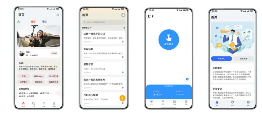 賦能現代社交與商務場景- 生態市場精選社交互動、辦公協作、人才招聘等領域的HarmonyOS Next開發模板,幫助開發者構建即時通訊應用、實現高效團隊協作工具以及開發智能招聘服務平台。(本部分包括:社交相親元服務模板、筆記應用模板、商務辦公應用模板、求職招聘應用模板)