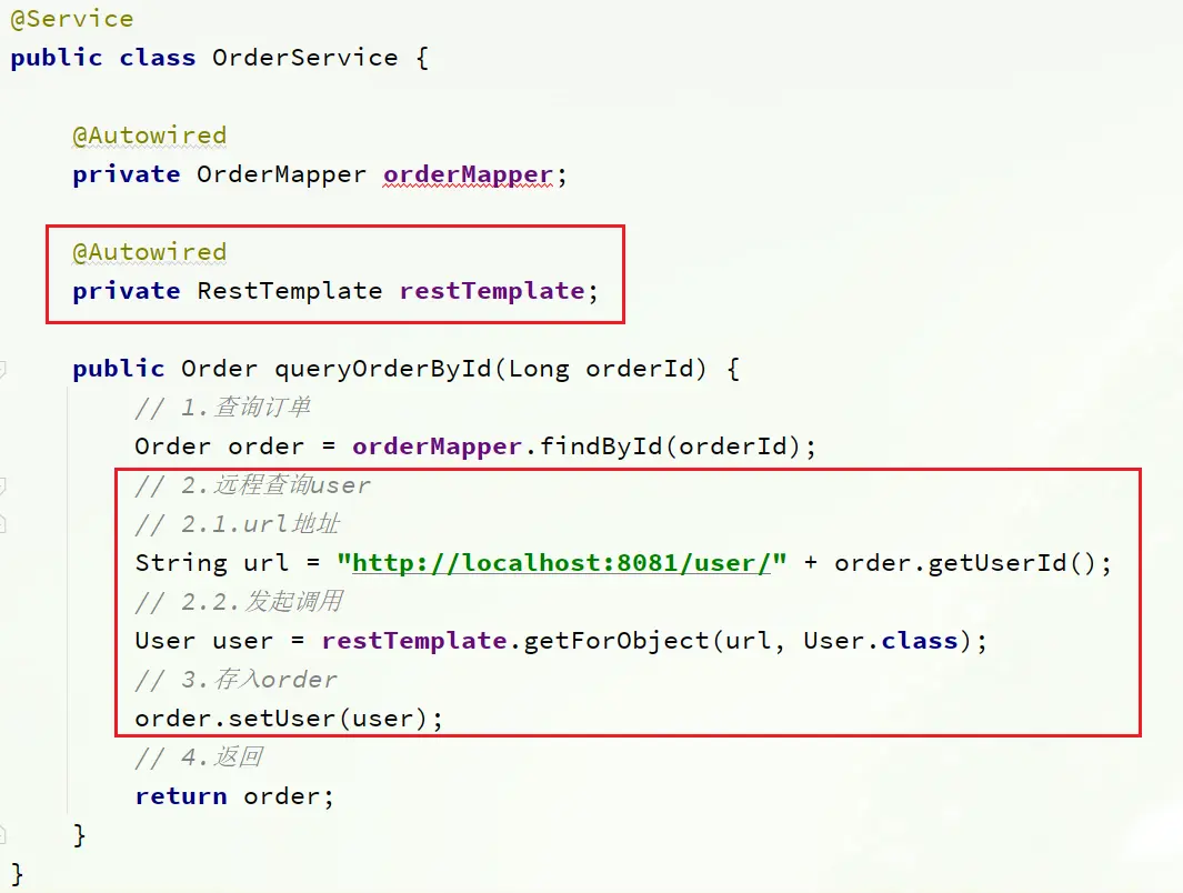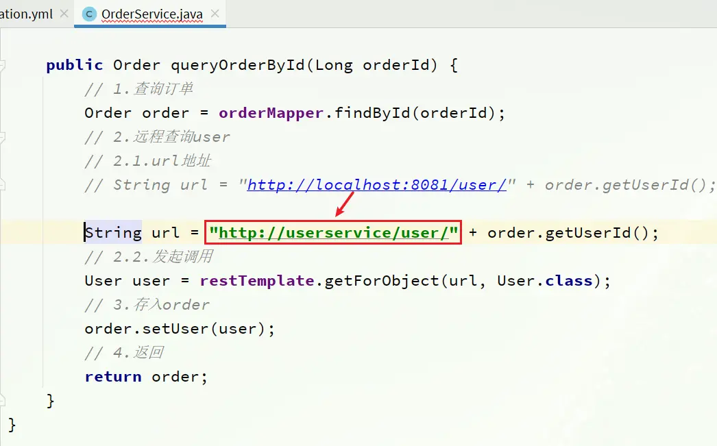 • 修改order-service服務中的OrderService類中的queryOrderById方法,根據Order對象中的userId查詢User