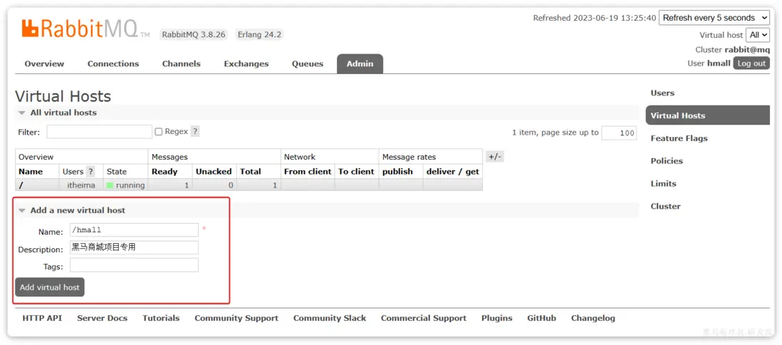 此時,點擊頁面右上角的virtual host下拉菜單,切換virtual host/hmall
