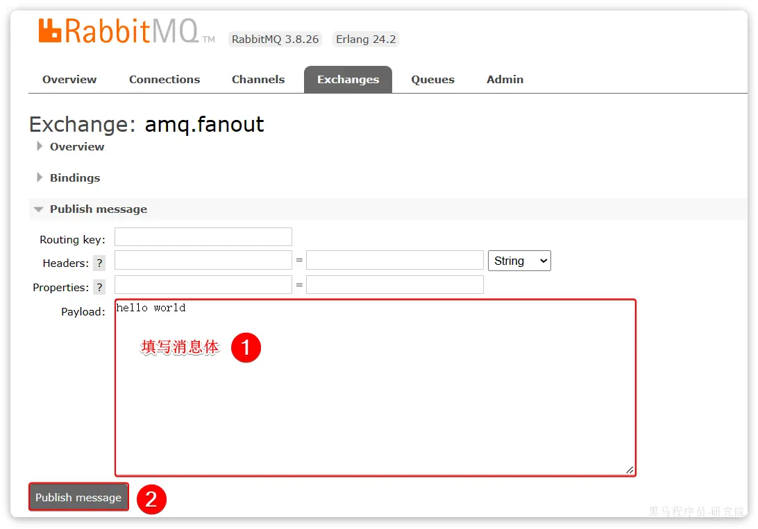 再次回到exchange頁面,找到剛剛綁定的amq.fanout,點擊進入詳情頁,再次發送一條消息: