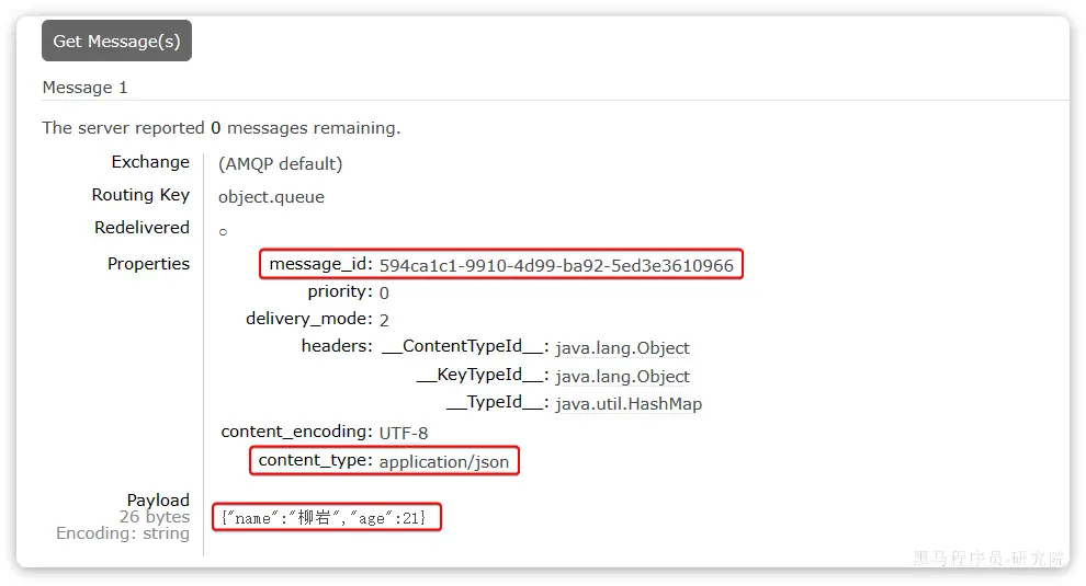 此時,我們到MQ控制枱刪除object.queue中的舊的消息。然後再次執行剛才的消息發送的代碼,到MQ的控制枱查看消息結構: