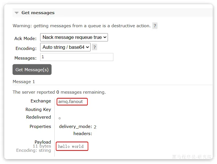 注意,這裏我們先不要給這個隊列添加消費者,我們要查看消息體的格式。
