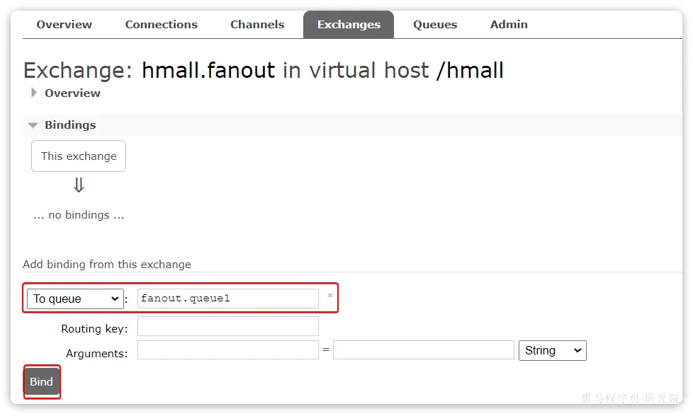 點擊Exchanges選項卡,點擊amq.fanout交換機,進入交換機詳情頁,然後點擊Bindings菜單,在表單中填寫要綁定的隊列名稱: