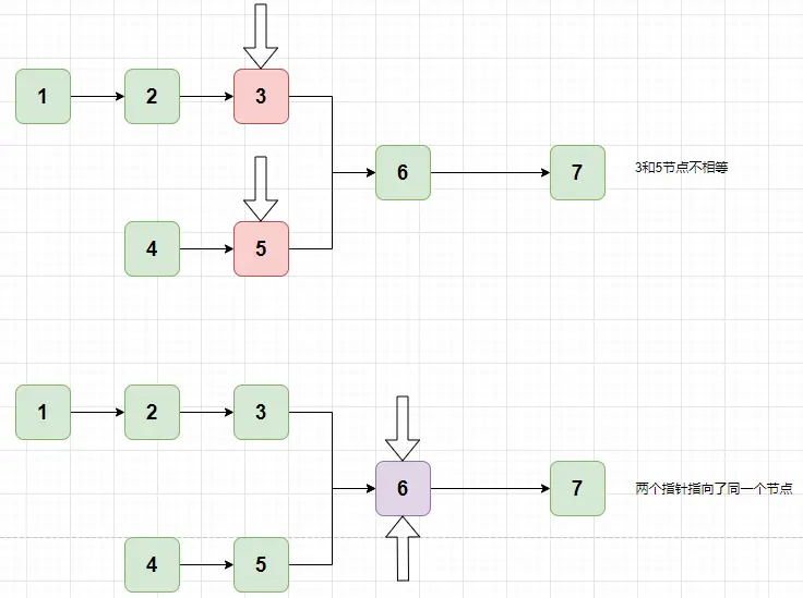 譬如現在有⼀個鏈表 1->2->3->6->7 ,另外⼀個鏈表 4->5->6->7 ,明顯可以看出第⼀個公共節點是6 。
