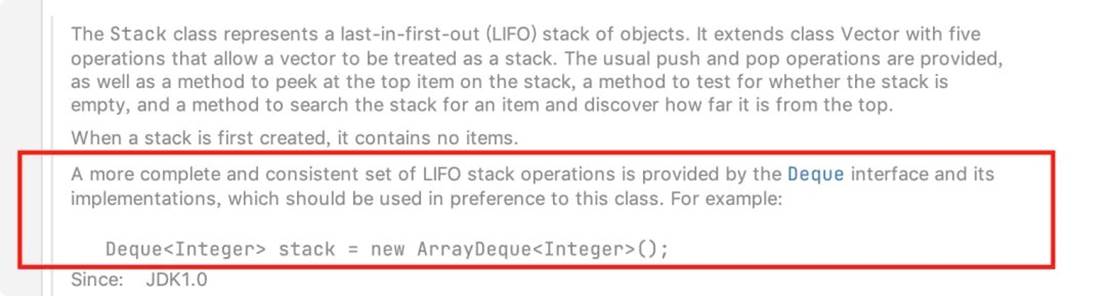 JDK 官方是不推薦使用 Stack,之所以還有很多人在使用,是因為 JDK 並沒有加 deprecation 註解,只是在文檔和註釋中聲明不建議使用,但是很少有人會去關注其實現細節