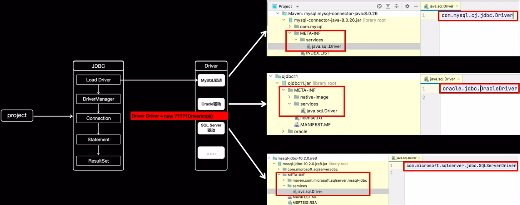 - 首先在java中定義了接口 java.sql.Driver,並沒有具體的實現,具體的實現都是由不同廠商來提供的。
