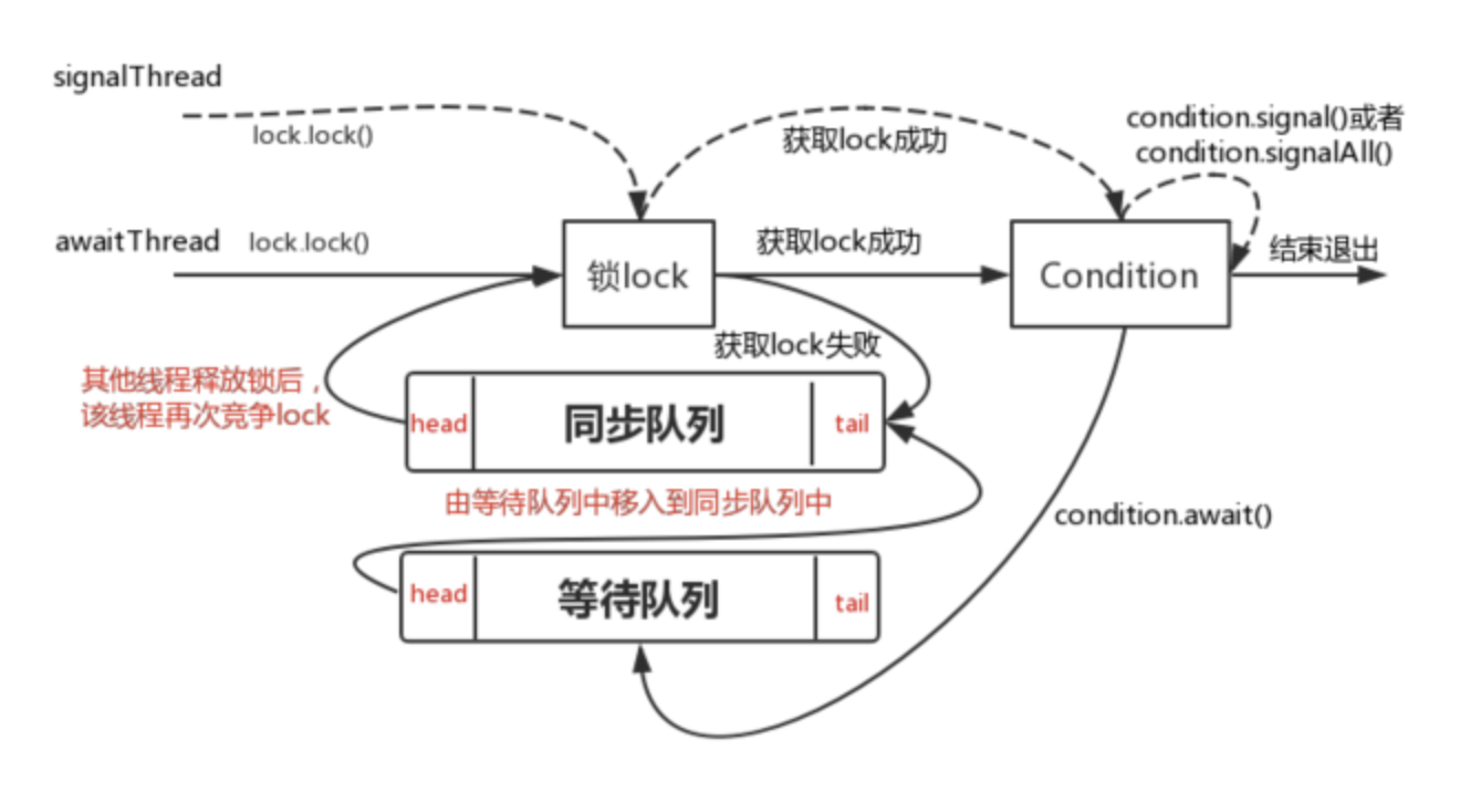 線程 awaitThread 先通過 lock.lock() 方法獲取鎖,成功後調用 condition.await 方法進入等待隊列,而另一個線程 signalThread 通過 lock.lock() 方法獲取鎖成功後調用了 condition.signal 或者 signalAll 方法,使得線程 awaitThread 能夠有機會移入到同步隊列中,當其他線程釋放 lock 後使得線程 awaitThread 能夠有機會獲取 lock,從而使得線程 awaitThread 能夠從 await 方法中退出並執行後續操作。如果 awaitThread 獲取 lock 失敗會直接進入到同步隊列。