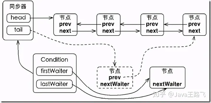 - 等待隊列分為首節點和尾節點。當一個線程調用Condition.await()方法,將會以當前線程構造節點,並將節點從尾部加入等待隊列。
