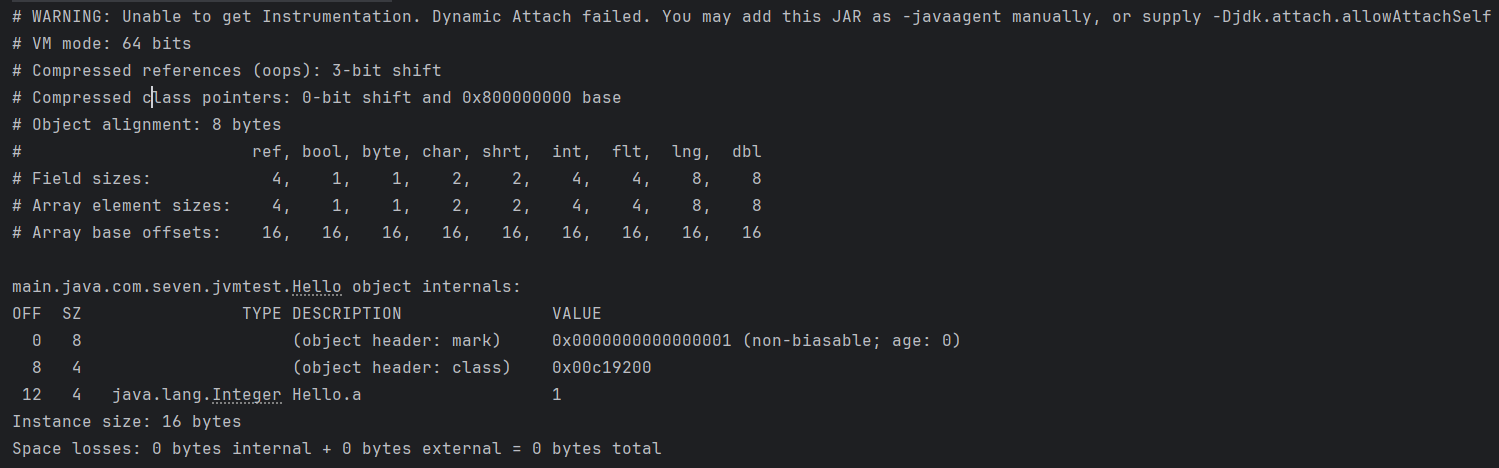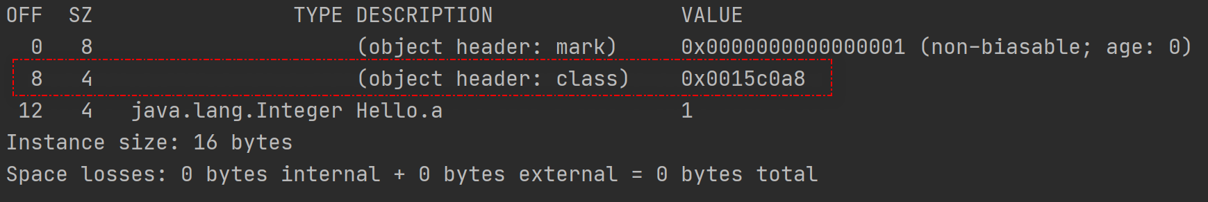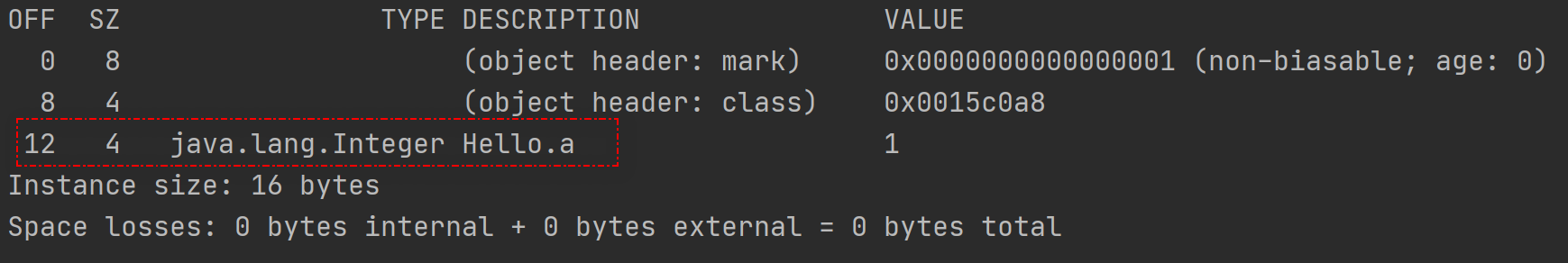 Hello類只有一個Integer類型的變量a,它在64位虛擬機下開啓指針壓縮佔據4字節,未開啓指針壓縮佔據8字節大小。需要注意的是,這裏的8字節存儲的是Integer對象指針大小,而非int類型的數值所佔內存大小。