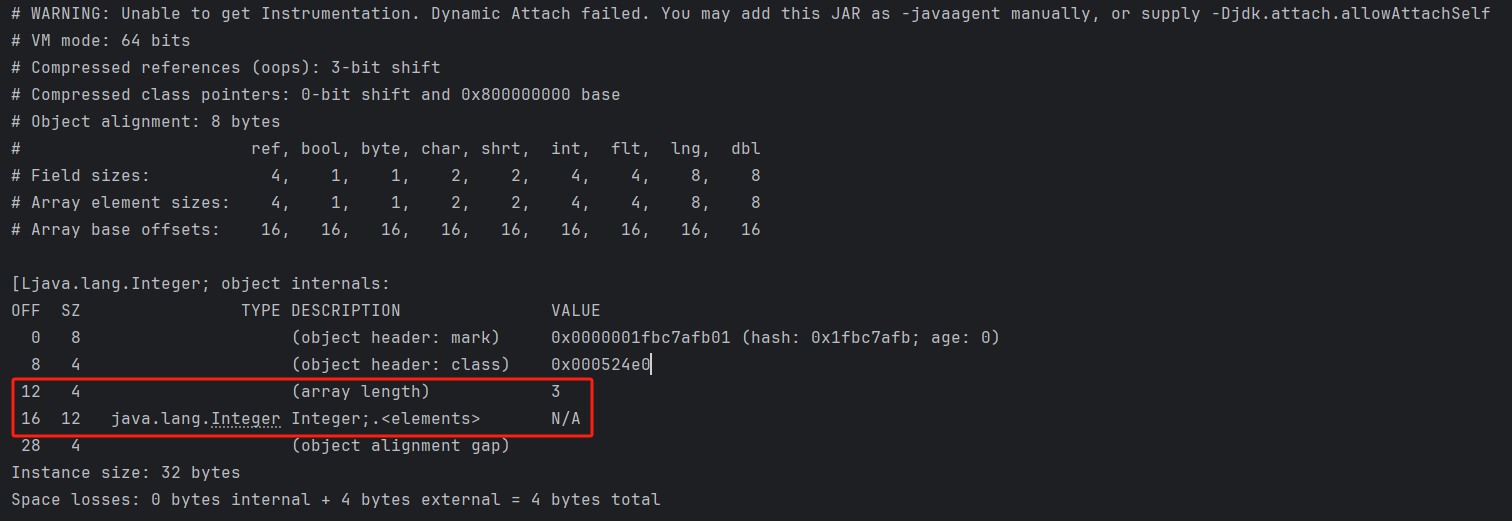 需要注意的是這裏的Integer[]數組裏面都是Integer對象,而非int類型的數值,它是Integer基本類型包裝類的實例,這裏的數組內存地址中存儲的是每個Integer對象的指針引用,從輸出的VM信息的對照表中,“ref”類型佔據8字節,所以才是3*8為24字節大小。