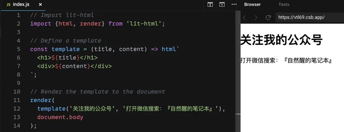 lit-html 的出現就儘可能的規避了之前模板引擎的問題,通過現代瀏覽器原生的能力來構建模板。