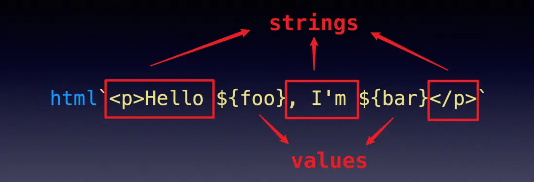 整個字符串會被動態的表達式進行切割成三部分,這個三個部分會組成一個數組,做為第一個參數傳入 html 標籤函數,而動態的表達式經過計算後得到的值會做為後面的參數一次傳入,我們可以將 strings 和 values 打印出來看看: