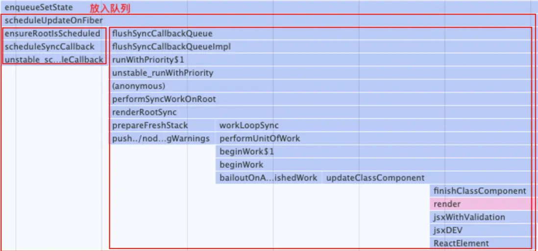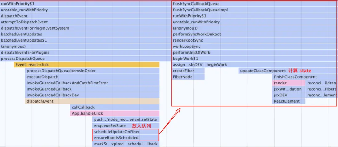 在調用棧中,可以看到 Component.setState 方法最終會調用enqueueSetState 方法 ,而 enqueueSetState 方法內部會調用 scheduleUpdateOnFiber 方法,區別就在於正常調用的時候,scheduleUpdateOnFiber 方法內只會調用 ensureRootIsScheduled ,在事件方法結束後,才會調用 flushSyncCallbackQueue 方法。而脱離 React 事件流的時候,scheduleUpdateOnFiber 在 ensureRootIsScheduled 調用結束後,會直接調用 flushSyncCallbackQueue 方法,這個方法就是用來更新 state 並重新進行 render。