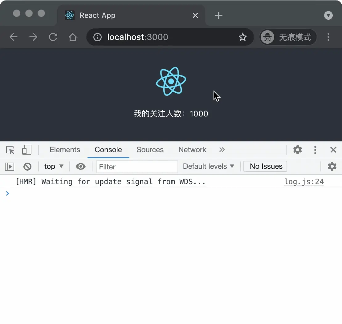上面的 React Logo 綁定了一個點擊事件,現在需要實現這個點擊事件,在點擊 Logo 之後,進行一次 setState 操作,在 set 操作完成時打印一個 log,並且在 set 操作之前,分別添加一個宏任務和微任務。代碼如下: