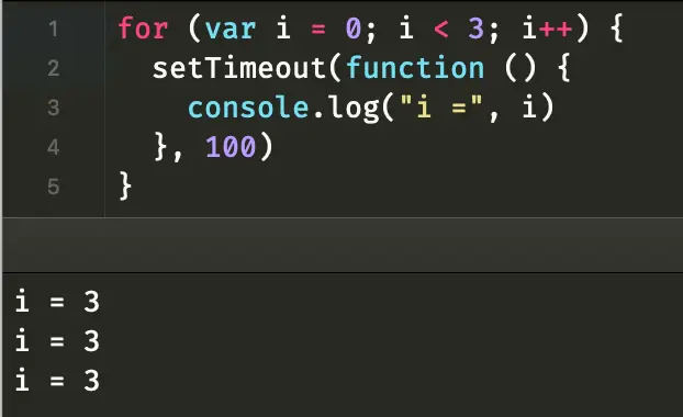 這裏連續聲明瞭三個異步任務,100毫秒 後會輸出變量 i 的結果,按照正常的邏輯應該會輸出 0、1、2 這三個結果。