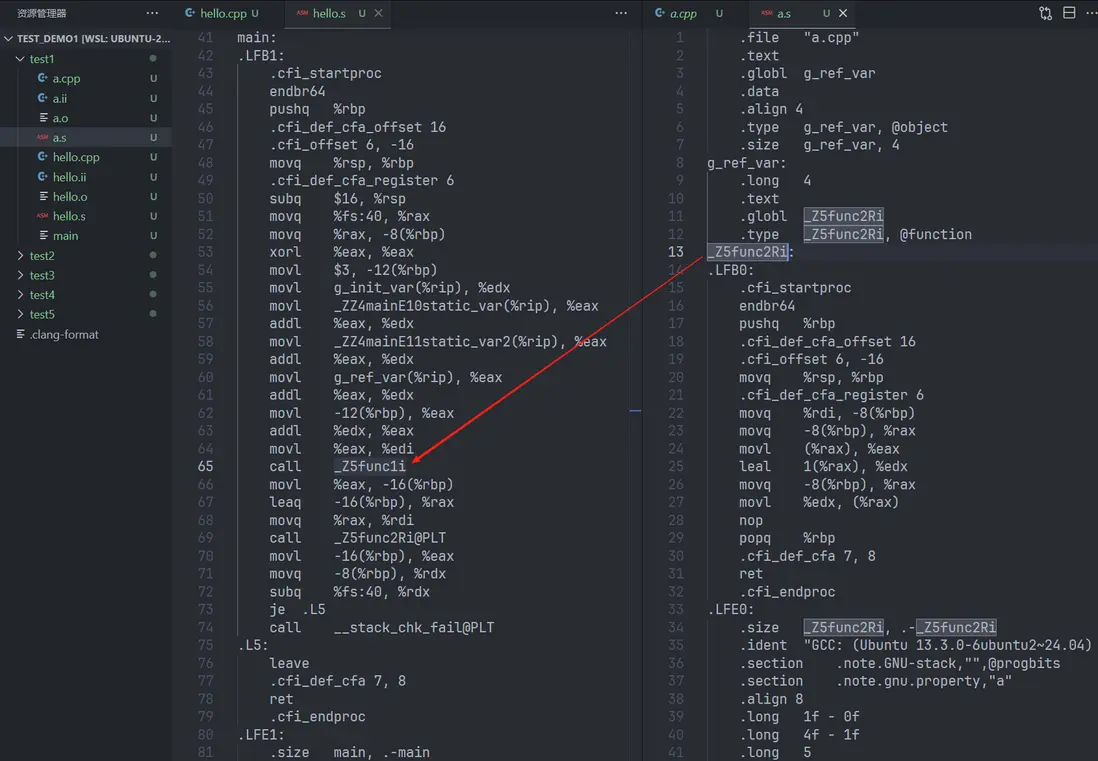 編譯 .ii 文件生成了彙編代碼文件 .s,可以打開看一下,裏面都是彙編指令,另外如果留意一下,可以發現一些符號決議的端倪: