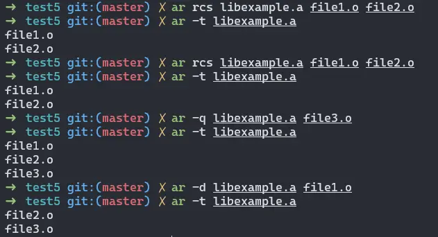 然後甚至可以用 ar x 將靜態庫解壓縮還原成兩個 .o 目標文件,然後如果再有一個 file3.o,可以用 ar -q 往靜態鏈接庫裏塞一個新的 .o: