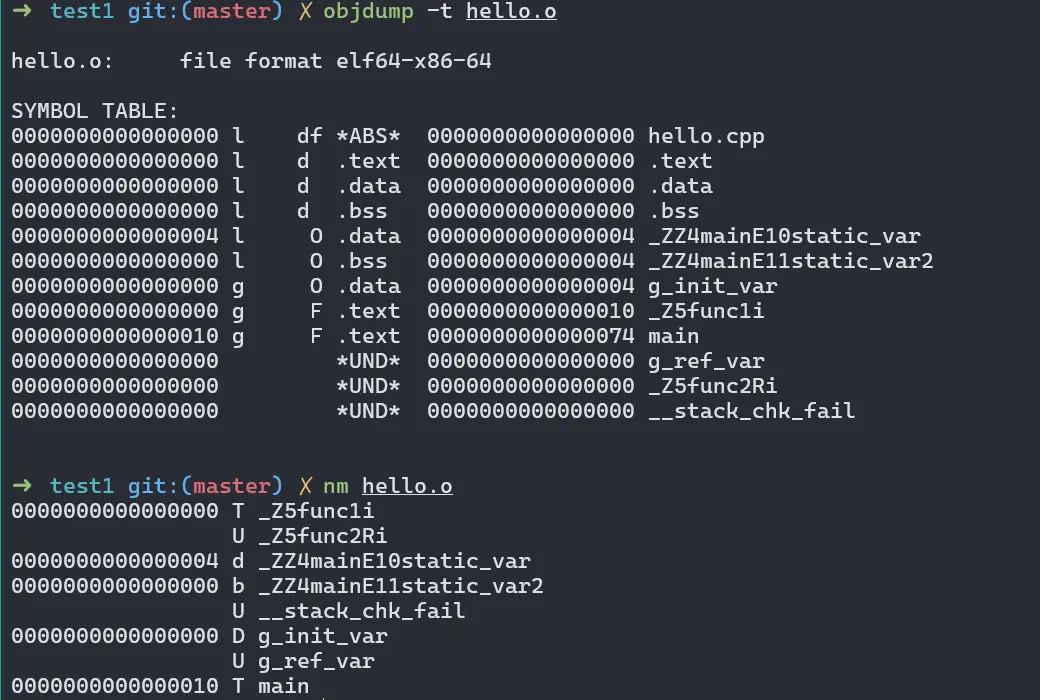 l表示本地符號 local,只有目標文件內部可見,g表示全局符號 global(如func1、main、g_init_var,Linux 上符號默認對外可見,需要手動在編譯時用-fvisibility=hidden或用__attribute__((visibility("hidden")))將符號設為外部不可見,在 Win 上符號默認對外不可見,需要用__declspec(dllexport)主動將符號標註為外部可見),設為外部不可見之後, objdump -t 或 nm 就找不到這個符號了。 - 第 3 列為符號類型,
