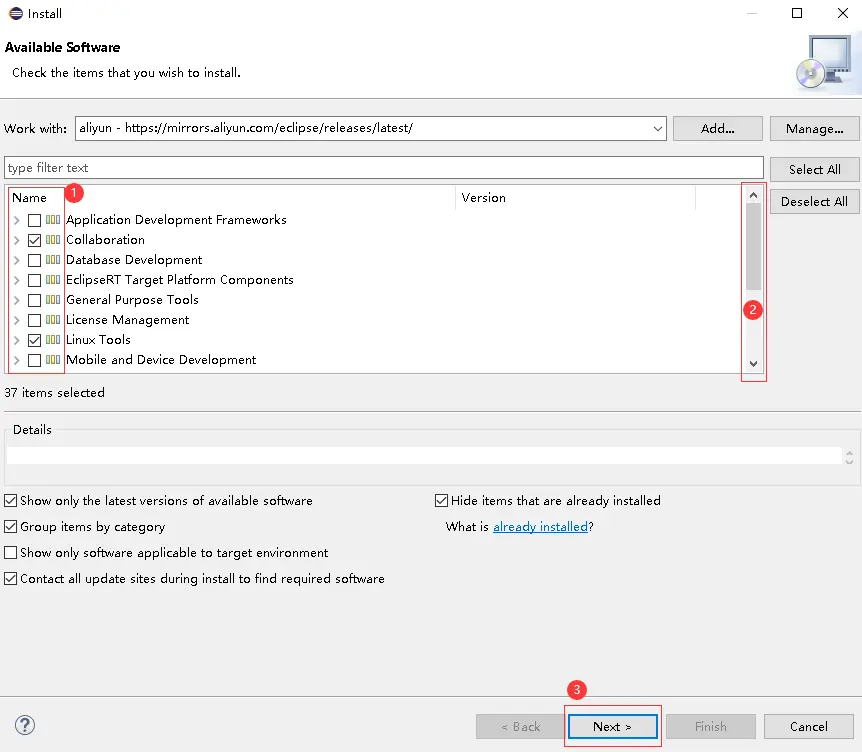 可以根據自己的需求下載插件,拖動滑動條可以查看更多插件,需要的插件在前面打勾,按next繼續並下載,下載完後按finish結束