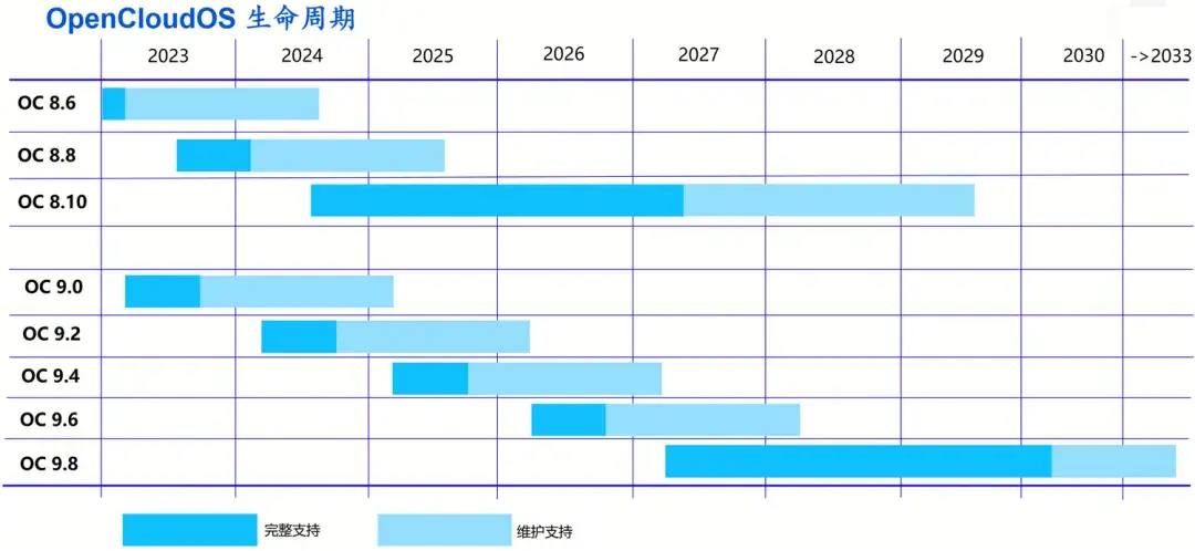 相比 CentOS 7 和其他開源社區版本,OpenCloudOS 故障率降低 70% 以上,且在典型業務場景中性能提升超50%。同時,OpenCloudOS 提供更長的生命週期支持,將會每 4 年發佈一個大版本,每個大版本中間會有小版本迭代。