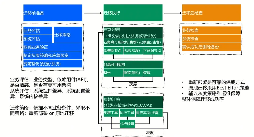 遷移到新系統後,建議對業務程序進行重編譯和部署,且遷移後進行詳細的功能、穩定性、性能和壓力等測試,並進行灰度上線部署。